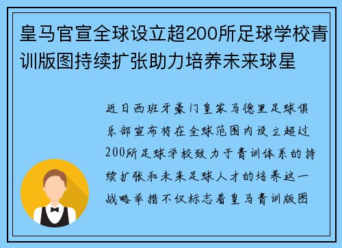皇马官宣全球设立超200所足球学校青训版图持续扩张助力培养未来球星 ⚽🌍